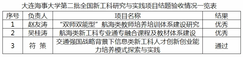 根据《教育部办公厅关于公布第二批全国新工科研究与实践项目结题验收结果的通知》(教高厅函〔2023〕21 号),ledong(中国)官方网站2020年获批的3项国家级新工科研究与实践项目全部通过结题验收。其中赵友涛教授负责的《“双师双能型”航海类教师培养培训体系建设研究》、吴桂涛教授负责的《航海类新工科专业通专融合课程及教材体系建设》项目获评优秀。