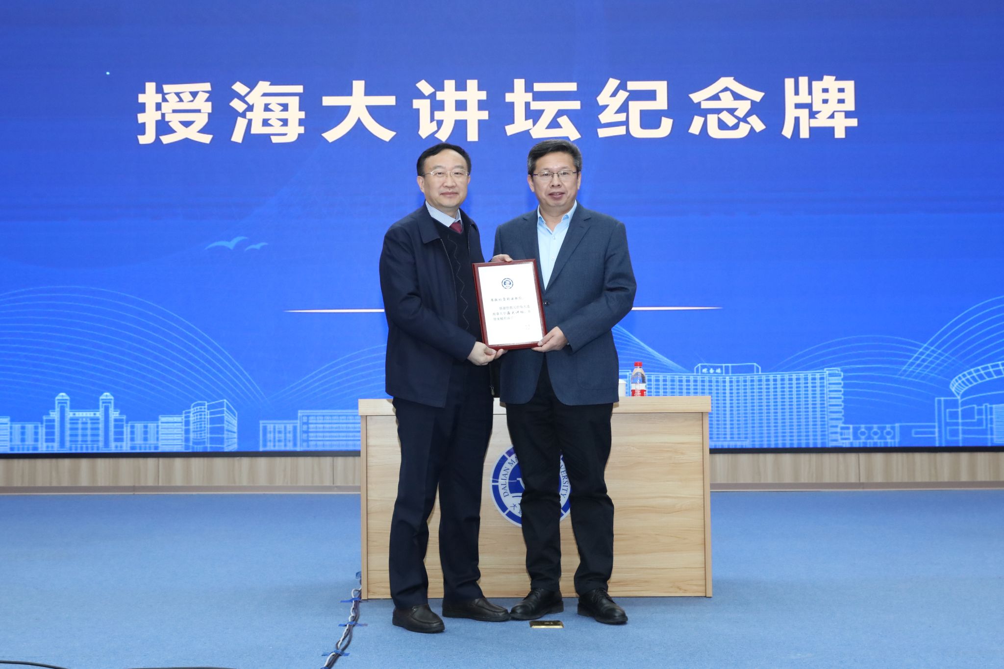 许民强代表学校向雷朝滋颁授“海大讲坛”纪念牌。