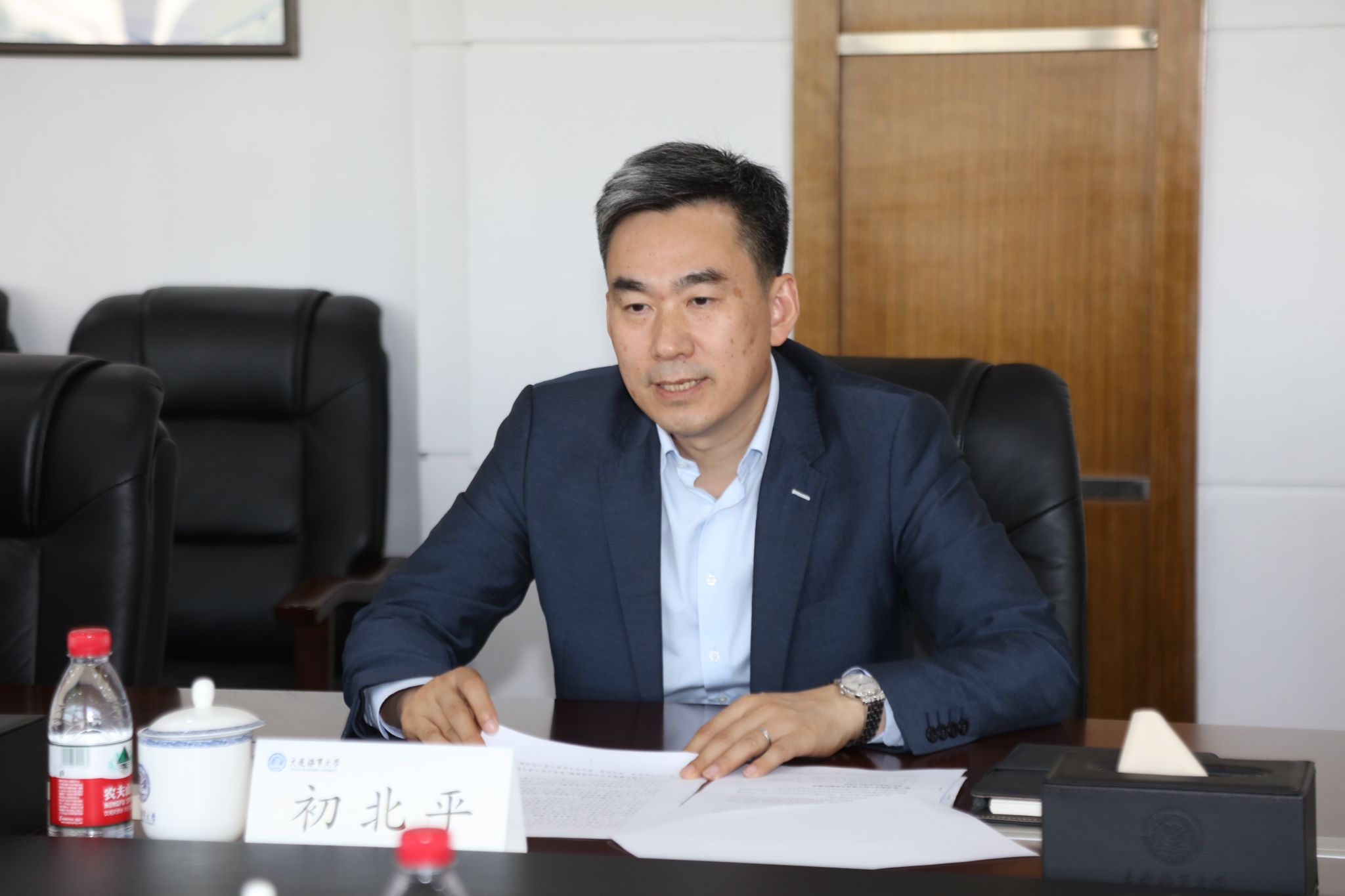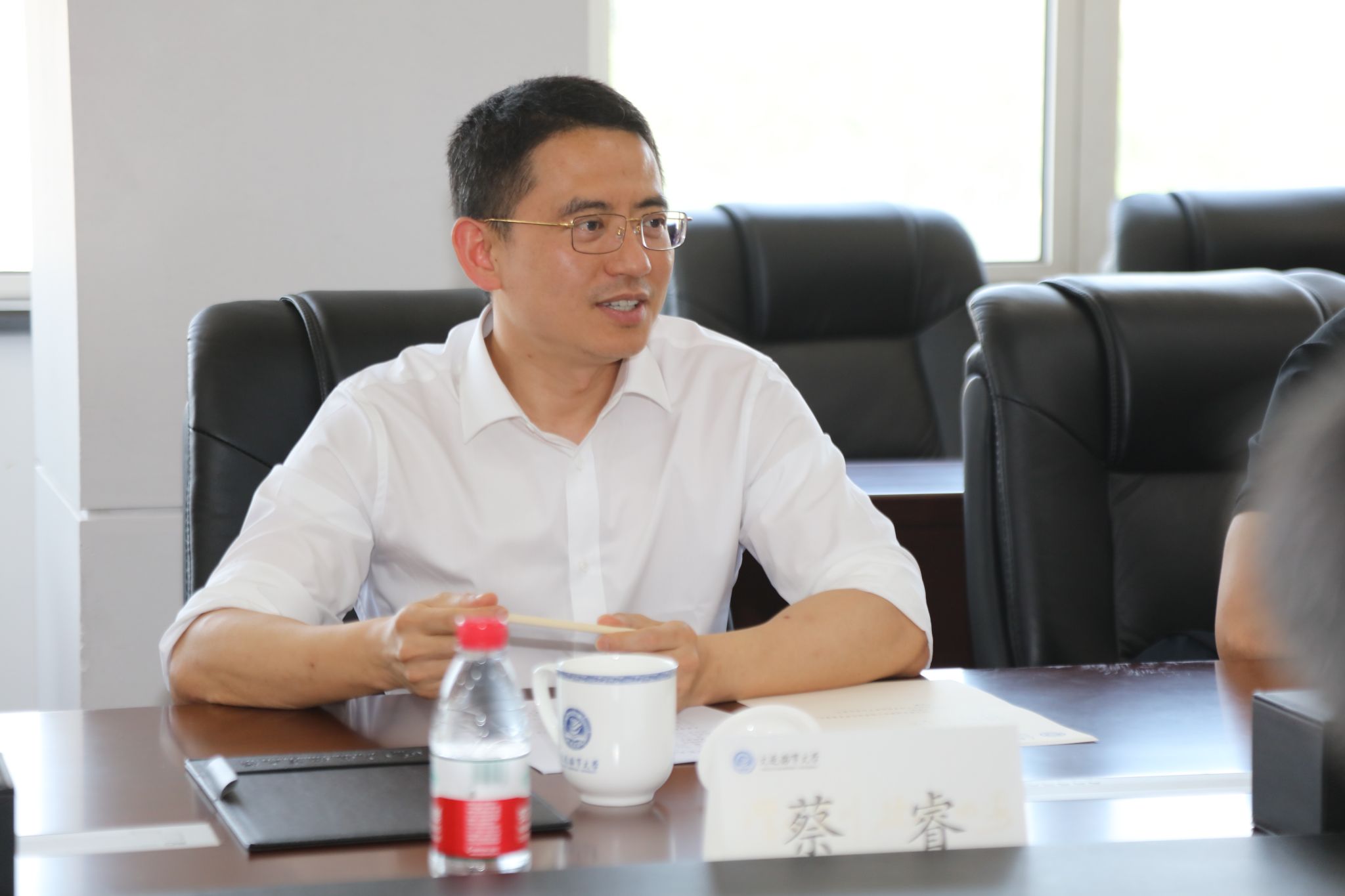 初北平对蔡睿一行表示欢迎,对省科技厅一直以来对学校发展的关心和支持表示感谢。他从历史沿革、学科专业、科技创新等方面介绍了学校整体情况,他还介绍了学校“双一流”建设和交通强国试点任务建设的主要内涵及进展成效。